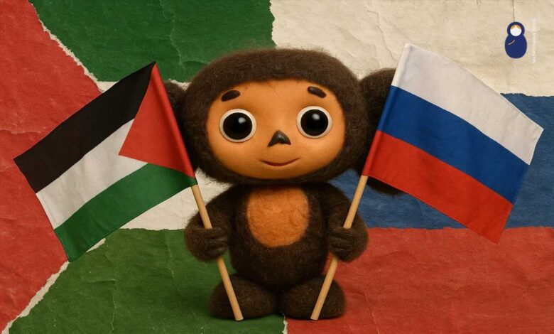 كما تجدر الإشارة إلى أن الرسوم الكرتونية التي ظهرت فيها تشيبوراشكا كانت تحمل رسالة واضحة لمناهضة الاستعمار ودعم القضايا العادلة، وهو ما ينسجم مع الموقف السوفيتي الرسمي تجاه النضال الفلسطيني. فقد كان الفلسطينيون، مثل ليلى خالد وياسر عرفات، يظهرون على شاشة التلفزيون السوفيتي كنموذجين يمقلان أبطال المقاومة، ما جعل من تشيبوراشكا وجينا رموزاً للعدالة وحماية المظلومين.